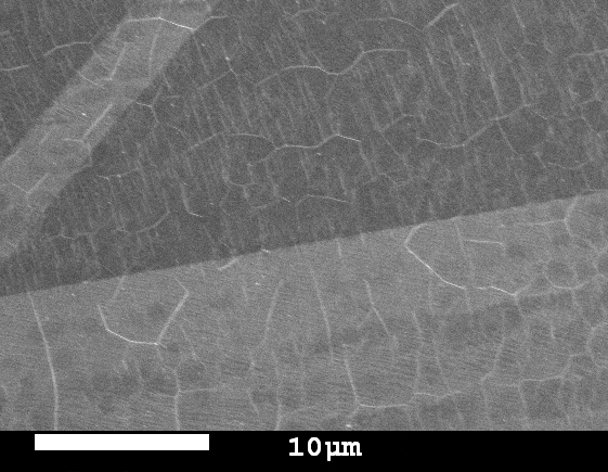 Copper foil thickness: 20 micron We offer graphene films that are predominantly single-layer graphene. These graphene films are grown on copper foil and continuous across copper surface steps and grain boundaries. Graphene is grown on both sides of the copper foil. If you require specifically graphene on one side only, please contact us directly. Etching of the underlying copper foil allows the carbon films to be transferred to other substrates such as glass, silicon dioxide or plastic films. To the best of our knowledge, there is no report of degradation of the CVD graphene over time when it is kept in a safe, dry place. The copper foil with single-layer graphene can exhibit some coloration due to slow oxidation of the copper foil, which does not affect the quality of the graphene film. 典型SEM圖像 |