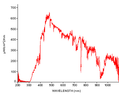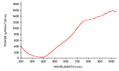 HR4000CG光譜儀使用HC-1光柵,它是一種的可變閃耀波長光柵,提供的波長范圍為200-1100nm。(預配置光柵的波長范圍為200-1100nm,但是有效的波段是在200-1050nm之間,請參照HC-1光柵效率曲線)。HR4000CG光譜儀還采用了OFLV-200-1100可變長通濾光片以消除二級和三級衍射的影響。光柵和濾光片在出廠時就已經安裝并固定。 光學平臺 HR4000CG光譜儀使用"HR"光學平臺,5um入射狹縫,并且升級為UV4紫外窗片,用來增強光譜儀在紫外區的響應。HR4000CG光譜儀是HR2000CG光譜儀的升級產品,使用3648像元的線性CCD陣列探測器,并且在200-1100波長范圍內提供好的光學分辨率。 USB2.0和數字輸入/輸出接口 HR4000CG光譜儀通過USB接口與PC連接,軟件從光譜儀上讀取設備的配置參數。HR4000CG光譜儀還提供10個可編程的數字輸入/輸出接口,一個模擬輸入口和一個模擬輸出口。 HG4000CG的光譜 太陽能光譜